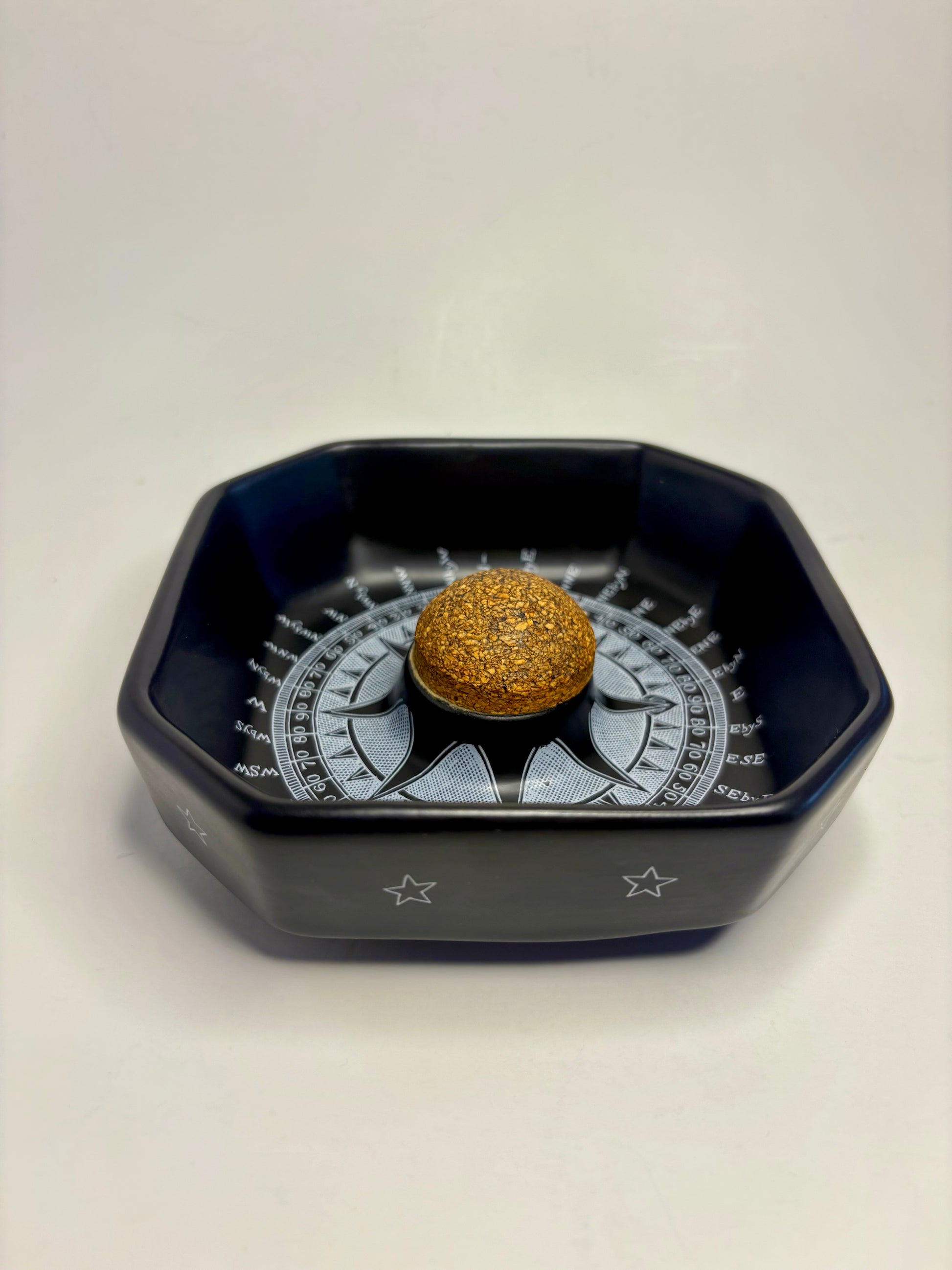 Black ceramic Dunhill ashtray with the compass rose / windrose design and original cork knocker. Octagonal form with clean lines and subtle star details around the sides. The cork is original and in good condition — not replaced. Marked Dunhill – Made in England on the base.
