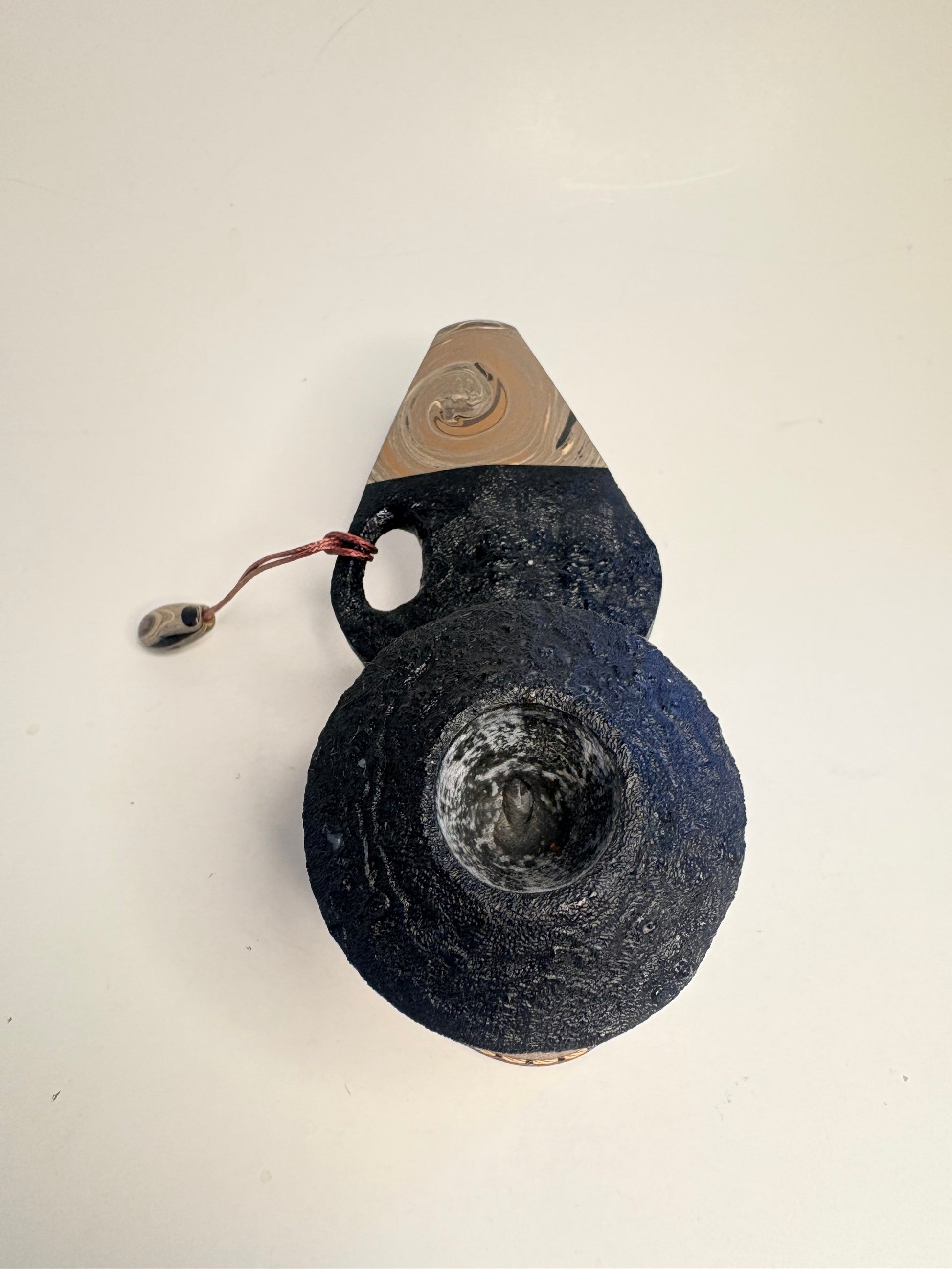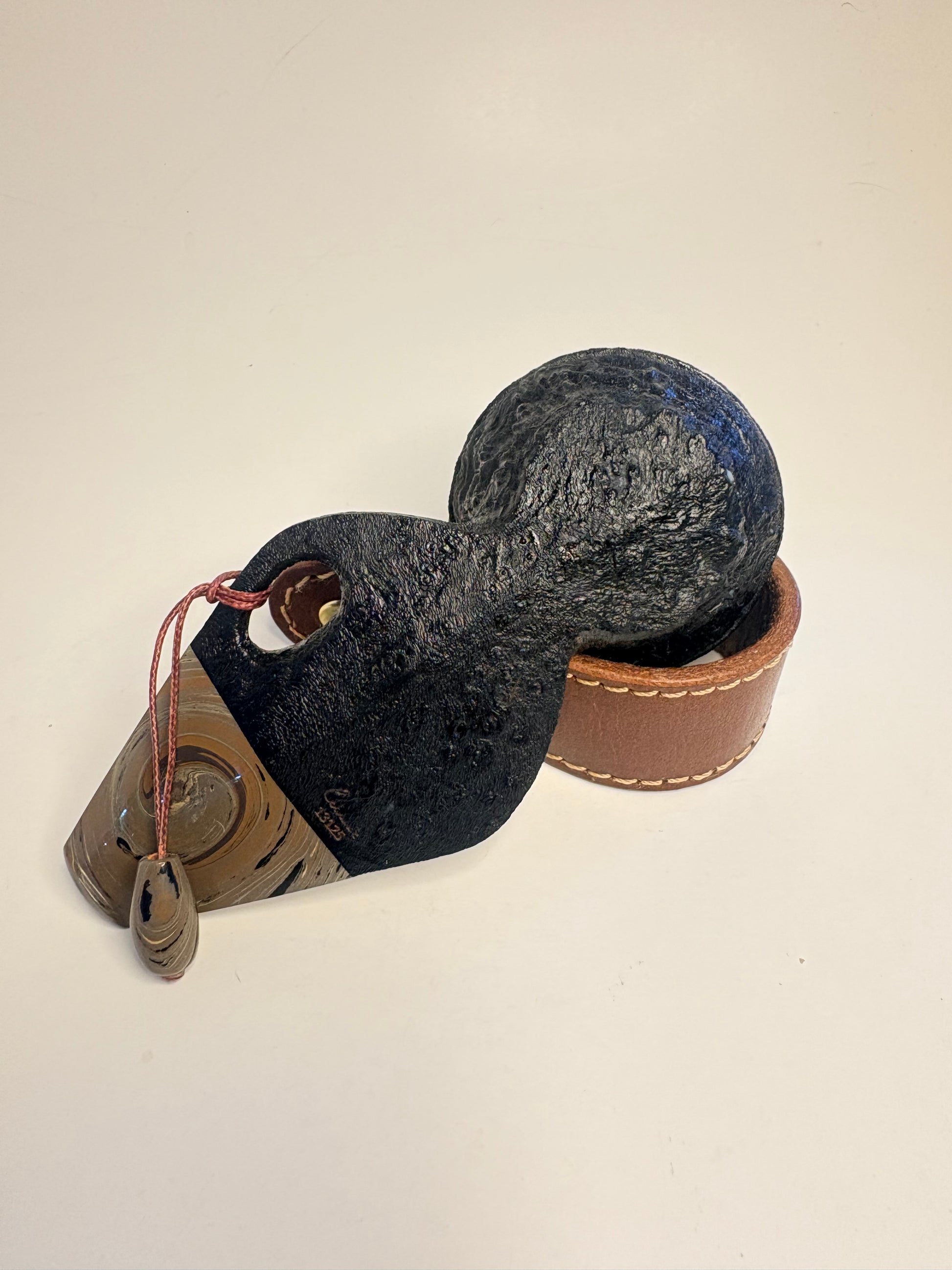 Handmade Eskimo by Czech carver Martin Čermák, executed in his signature sculptural style. The bowl flares into a wide, disc-like profile with a flattened heel and deep, volcanic texture across the exterior, contrasted by a smooth, softly rounded rim showing natural grain swirl. The shank transitions cleanly into a German ebonite stem with a subtle marbled pattern, shaped to a comfortable bite and finished with a lanyard pass-through — a functional nod to Čermák’s outdoors / workshop smoking inspiration.