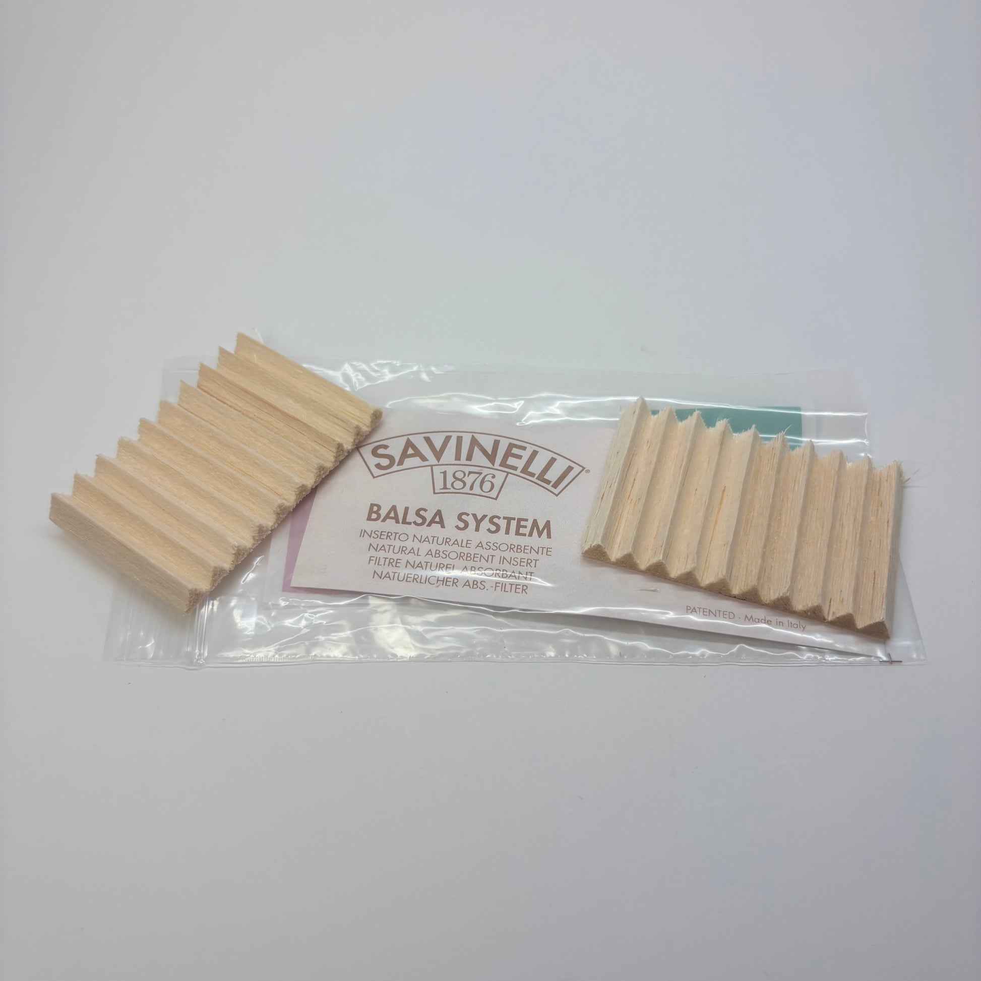 Savinelli 6mm Balsa Filters — the original Savinelli “Dry System” inserts, made from natural balsa wood to absorb moisture and condensation from the smoke stream without adding chemicals or altering flavour. The triangular profilekeeps the airway open so the pipe maintains an easy, natural draw while the porous balsa fibers wick away humidity that can cause gurgle and tongue bite.